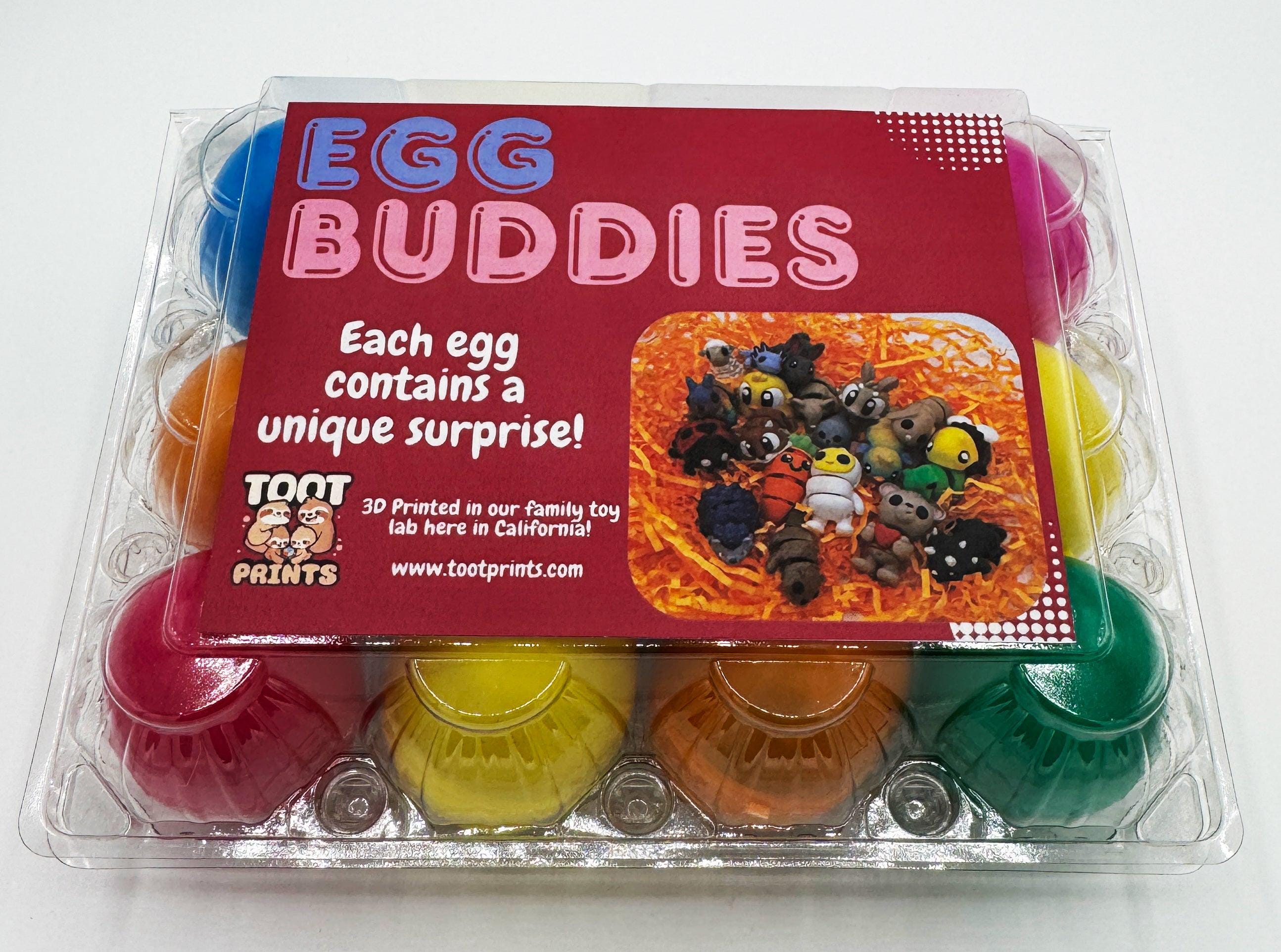 Eggs are getting more and more expensive! Why not mix things up and surprise your friends and family with Egg Buddies this year! Each carton of a dozen Egg Buddies contains 12 plastic eggs each filled with a unique 3D Printed toy from our collection of over 48 TOOTLES!!! All toys were 3D printed in our family toy factory here in California!