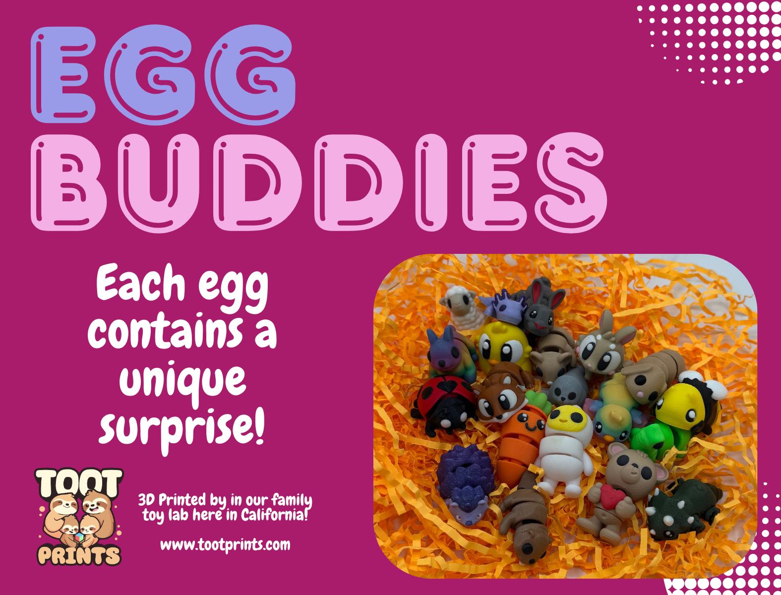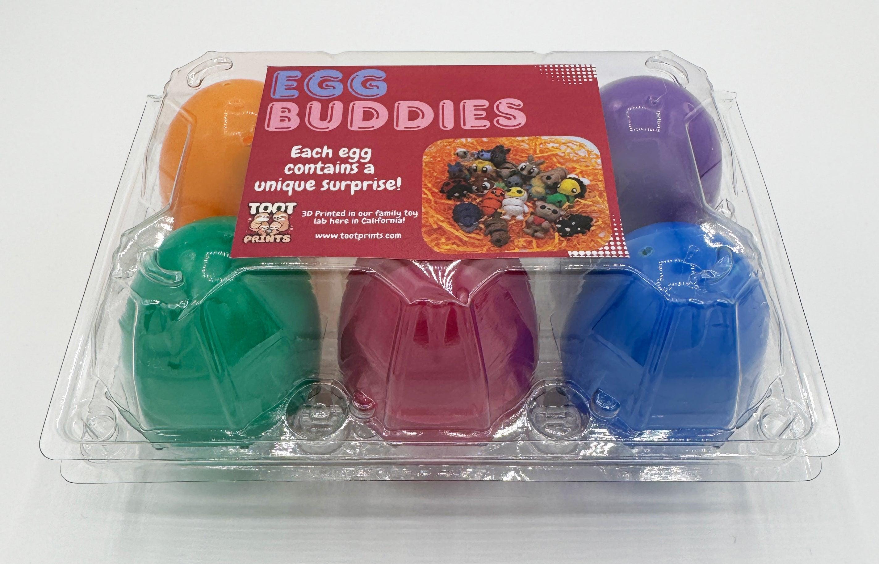 Eggs are getting more and more expensive! Why not mix things up and surprise your friends and family with Egg Buddies this year! Each carton of a half dozen Egg Buddies contains 6 plastic eggs each filled with a unique 3D Printed toy from our collection of over 48 TOOTLES!!! All toys were 3D printed in our family toy factory here in California!