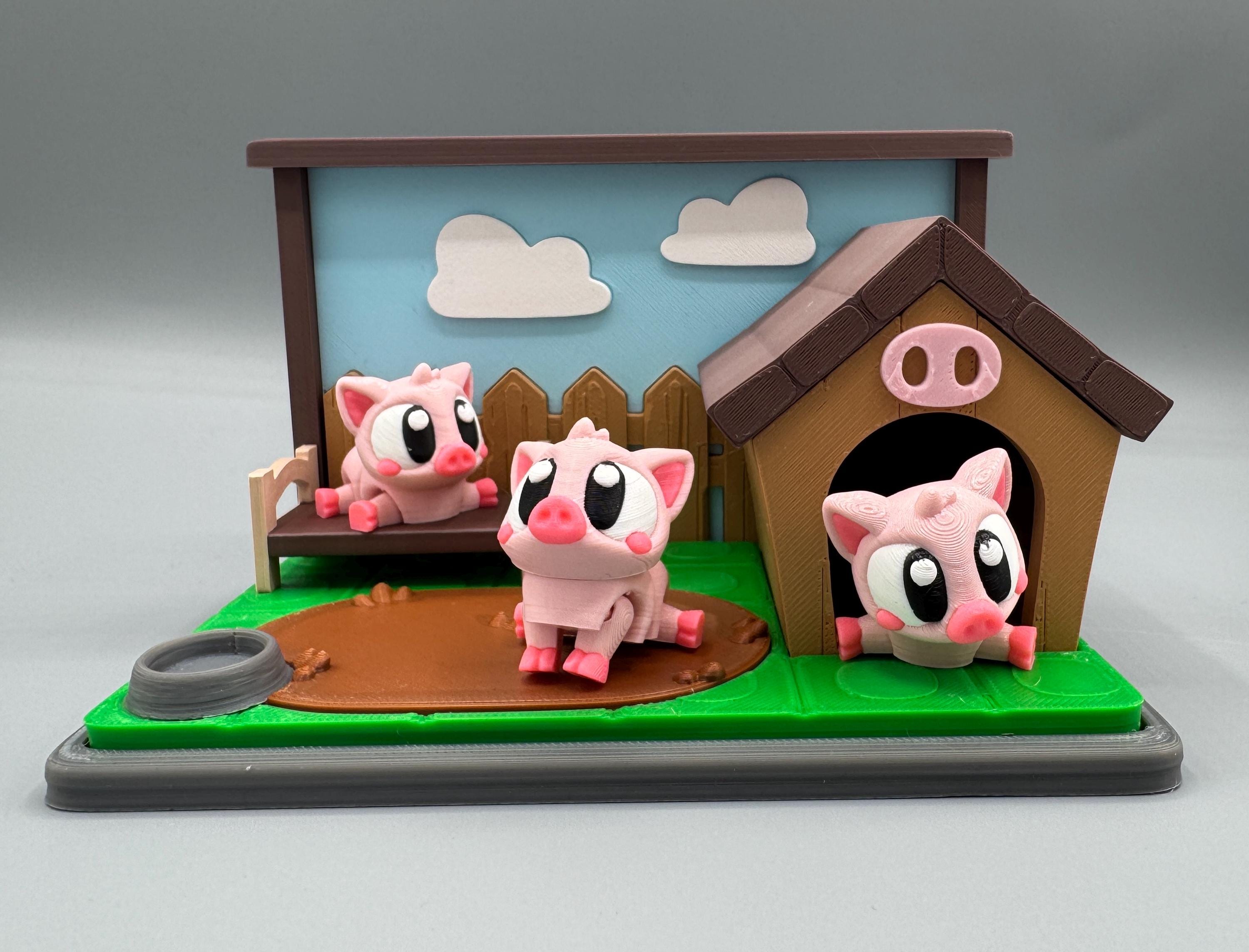 Bring adorable farmyard charm to your space with this 3D Printed Flexi Pig Pen Playset! This miniature scene features three bright-eyed articulated flexi pigs and a fully detailed pig pen base, complete with a mud puddle, feeding bowl, cozy pig house, fence, and a little bench for lounging pigs.