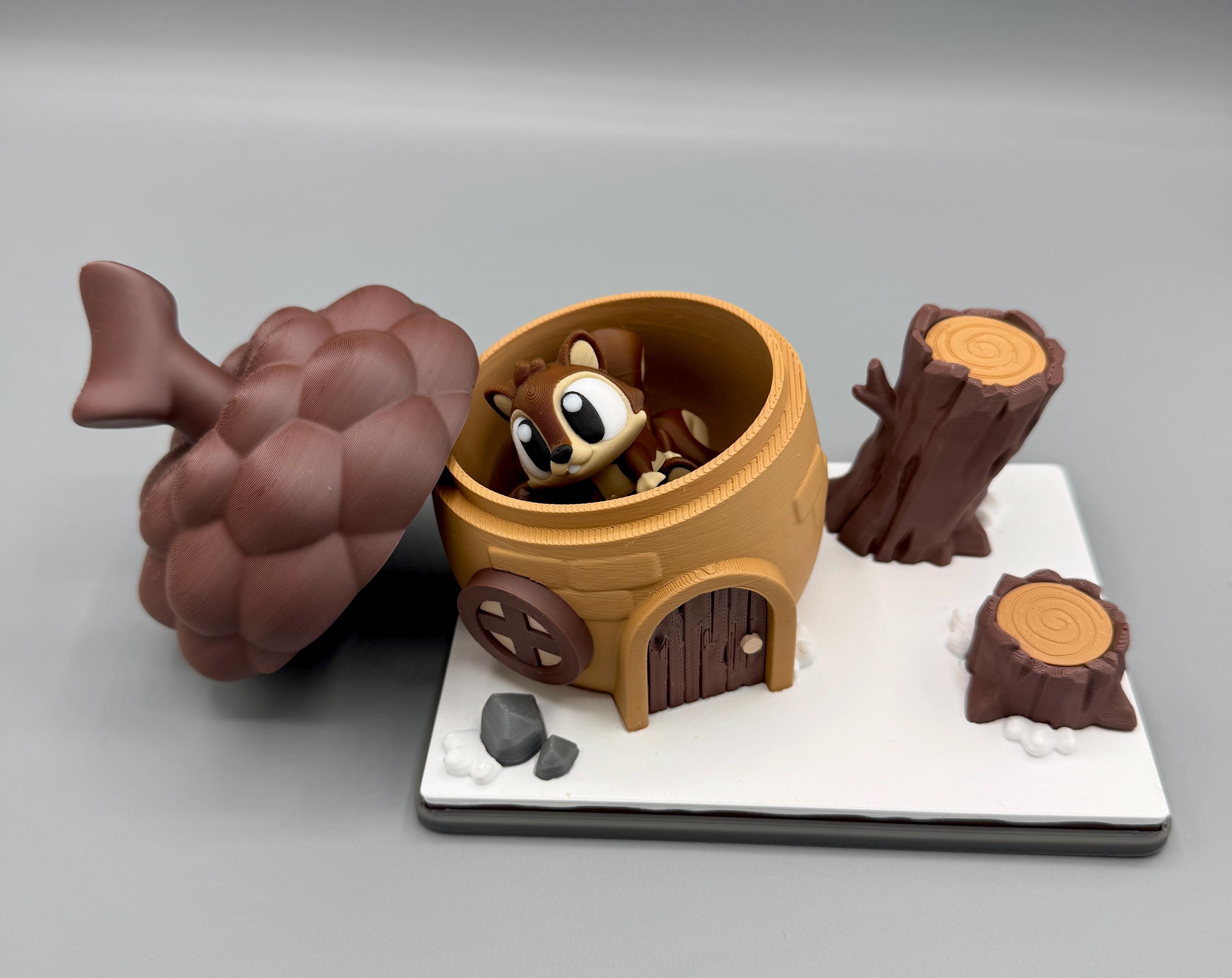 Bring cozy woodland charm to your home or desk with this 3D Printed Flexi Squirrel Acorn House Playset! This adorable miniature scene features an articulated flexi squirrel peeking out from a detailed acorn house with a removable acorn cap lid. The display base includes forest stumps, wood textures, small stones, and snowy accents to complete the woodland vibe.